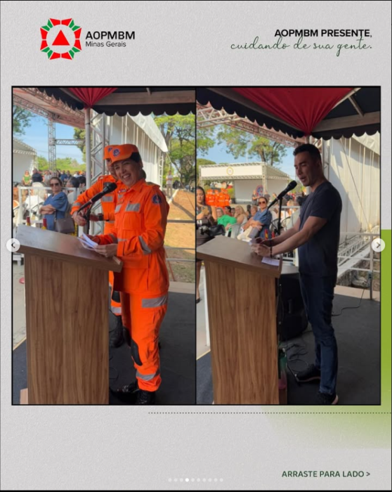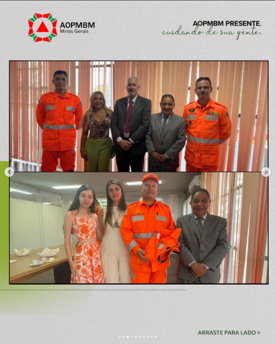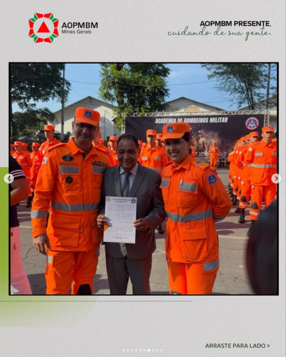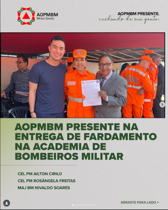 O 2º vice-presidente da AOPMBM e diretor do Departamento de Bombeiros Militares, Major Nivaldo, representou o presidente da AOPMBM, Cel Cirilo, nesta sexta-feira, na cerimônia de entrega de fardamento à Turma Miguel Arcanjo, realizada na Academia de Bombeiros Militar, no Complexo da Pampulha.