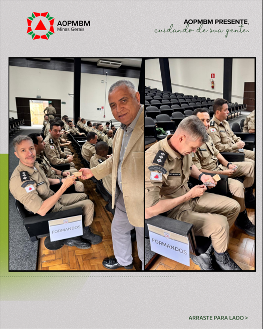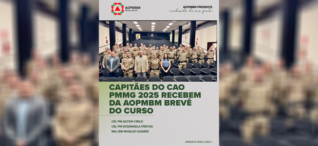 Tendo concluído a capacitação para o exercício de cargos próprios de oficiais intermediários e superiores, os militares do Curso de Aperfeiçoamento de Oficiais (CAO PMMG 2025) receberam, da AOPMBM, o brevê do curso nesta sexta-feira (31/10), no auditório do Clube dos Oficiais Militares Mineiros (COMM).