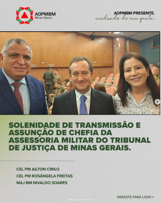 A cerimônia contou com a presença do presidente da AOPMBM, Cel Ailton Cirilo, e da vice-presidente Cel Rosângela de Freitas, reafirmando a proximidade da entidade com os espaços de representação e valorização dos oficiais da Polícia Militar e do Corpo de Bombeiros Militar de Minas Gerais.