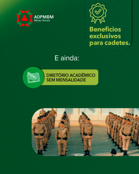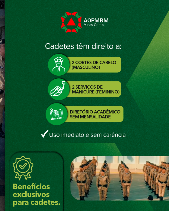 A AOPMBM está ao lado dos cadetes desde o início, oferecendo benefícios que fazem a diferença no dia a dia.